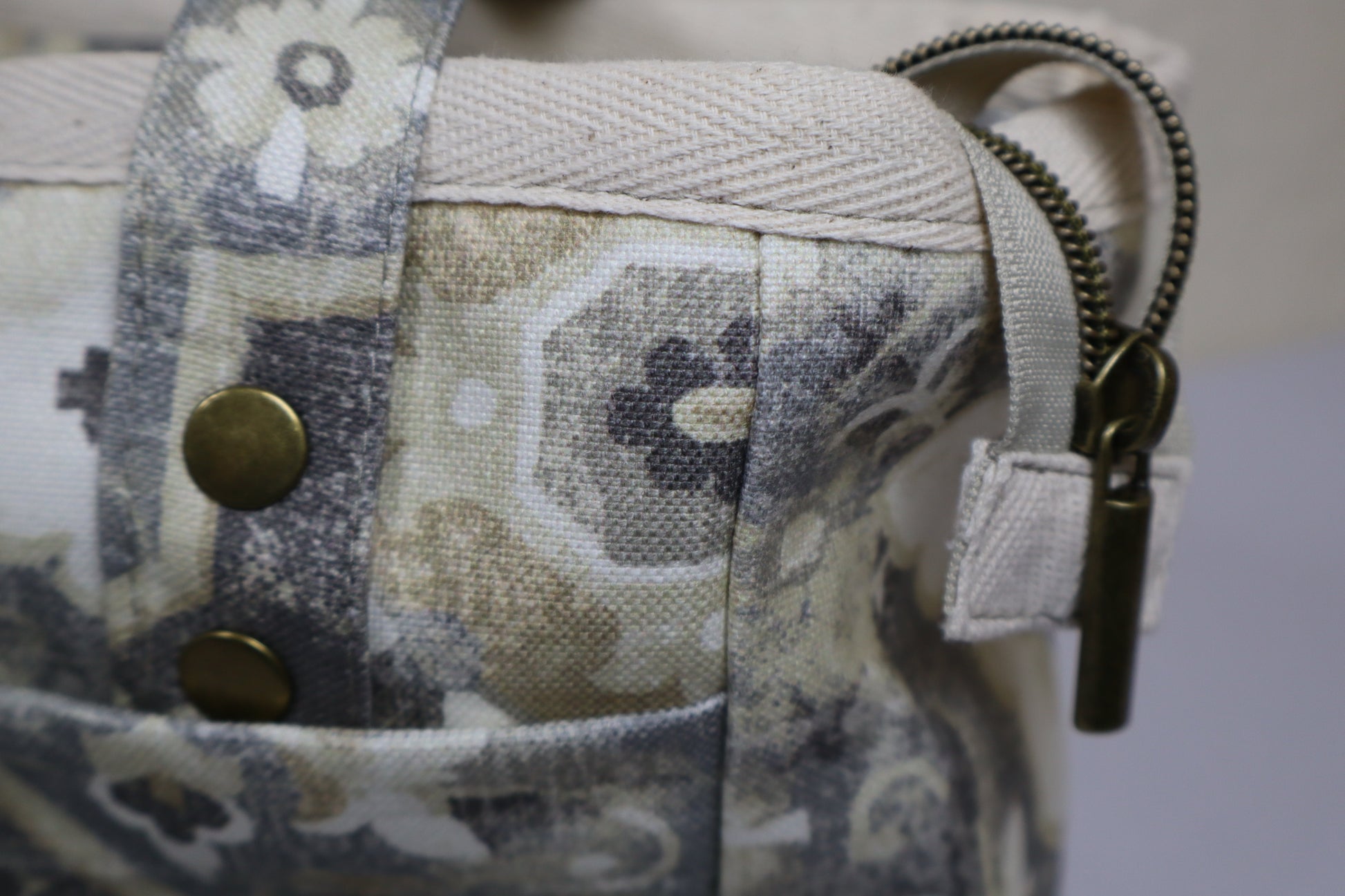 Meticulously sewn with soft cotton canvas fabric with a cotton twill design around the top. An antique brass zipper secures your items inside and the same smaller zipper closes a pocket on the inside. Brass grommets on the outside secures the 2 straps. Two pockets on the outside can hold your phone or passport.
