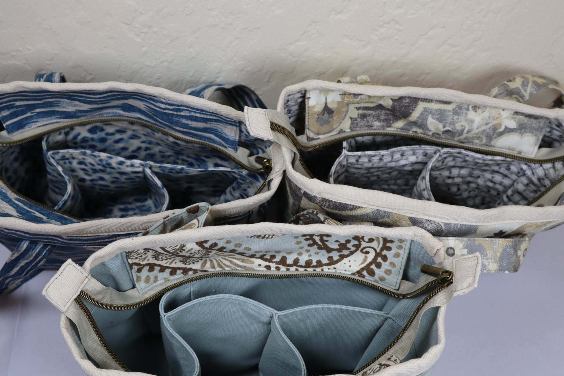 Contrasting matching fabric on the inside. We use lighter colors inside to make it easier to see what is in your bag! The 2 Zipper Wallet and the Folding Wallet each come in the same colors for an beautiful ensemble.