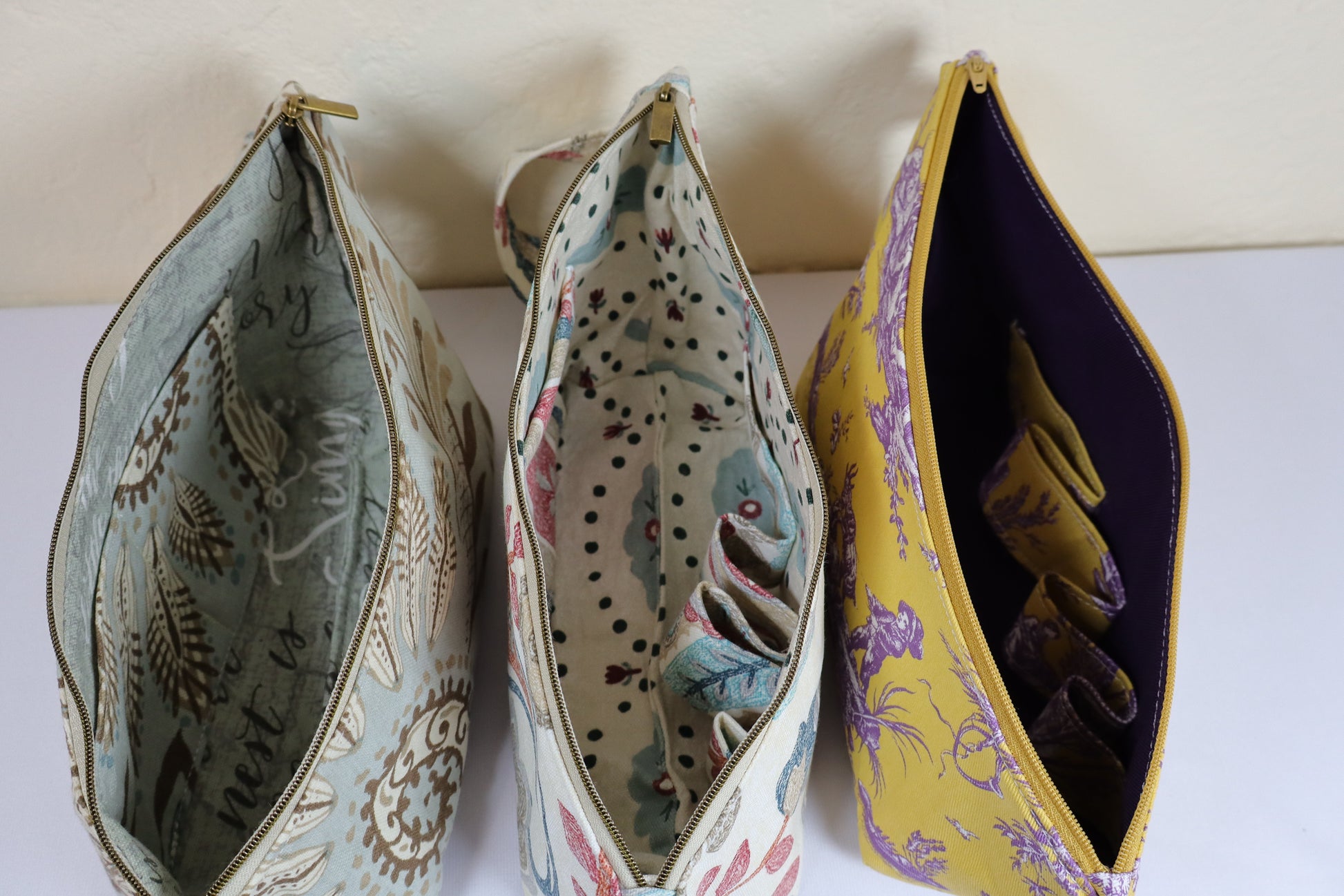 An antique brass zipper closes the bag tightly. A large sturdy handle lets you carry it easily. Inside, there are 2 plain pockets and 4 loops to secure bottles. Contrasting matching fabric on the inside. We use lighter colors to make it easier to see what is in your bag! Made in the USA