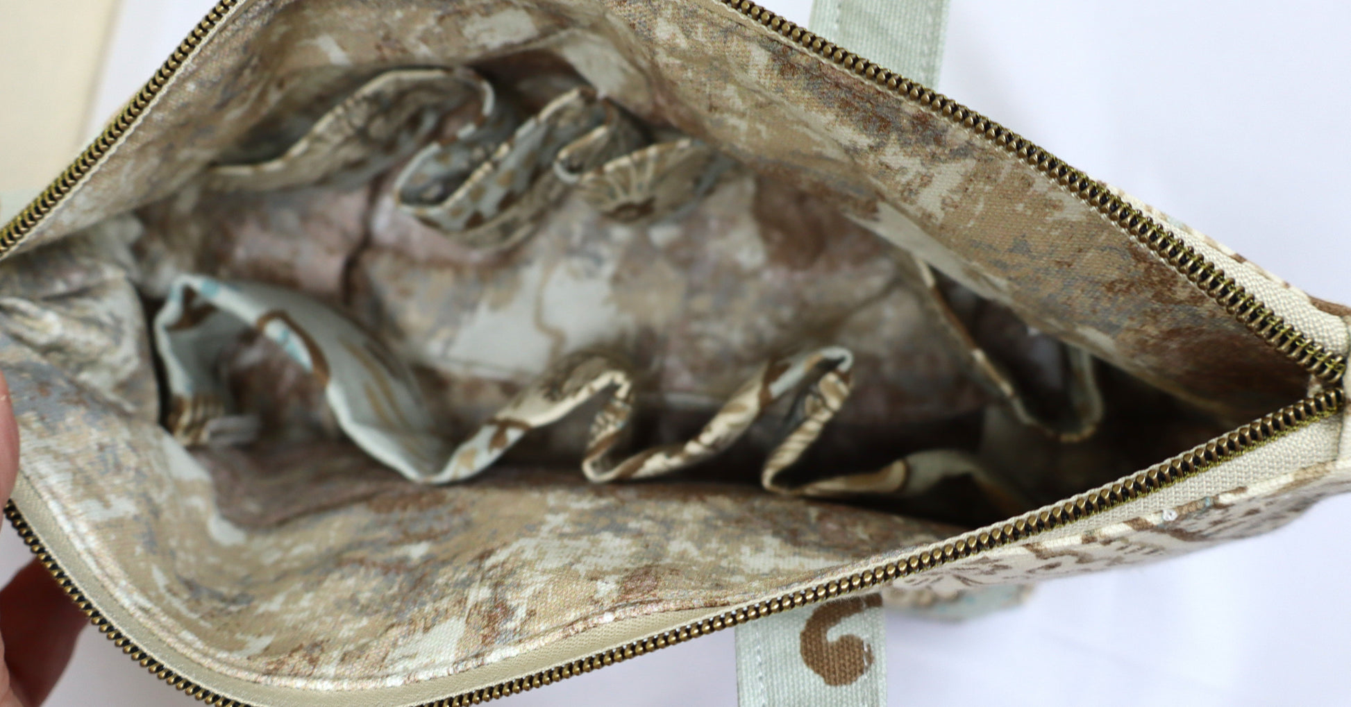Contrasting matching fabric on the inside. We use lighter colors to make it easier to see what is in your bag (except for the Gold Toile - OOPS!) Made in the USA